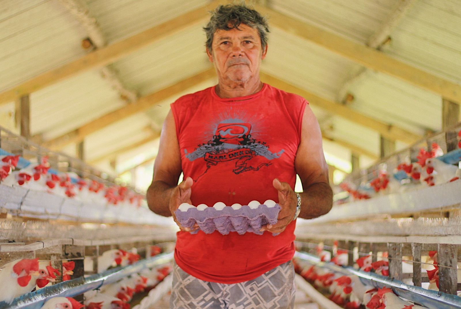 No sítio Boa Esperança, na Agrovila Iracema, distante 21 km da sede do município, Arlindo Gomes, 62 anos, auxilia o filho Elton, 38 anos, no empreendimento rural da avicultura de postura, com 2 mil animais, que produzem, em média, 900 ovos por dia, para comercialização no mercado local.
