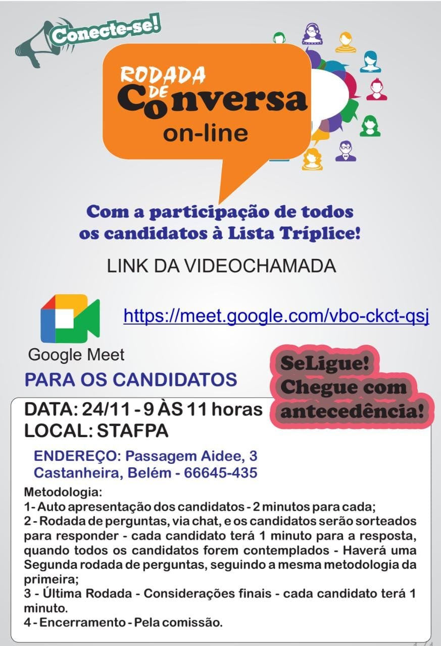 Os candidatos e candidatas estarão participando nesta quinta-feira (24) de uma Rodada de conversa que será transmitida pelo google meet, de 9 horas ao 11 horas, ocasião em que os servidores terão a oportunidade de conhecer as plataformas de trabalho de cada concorrente.