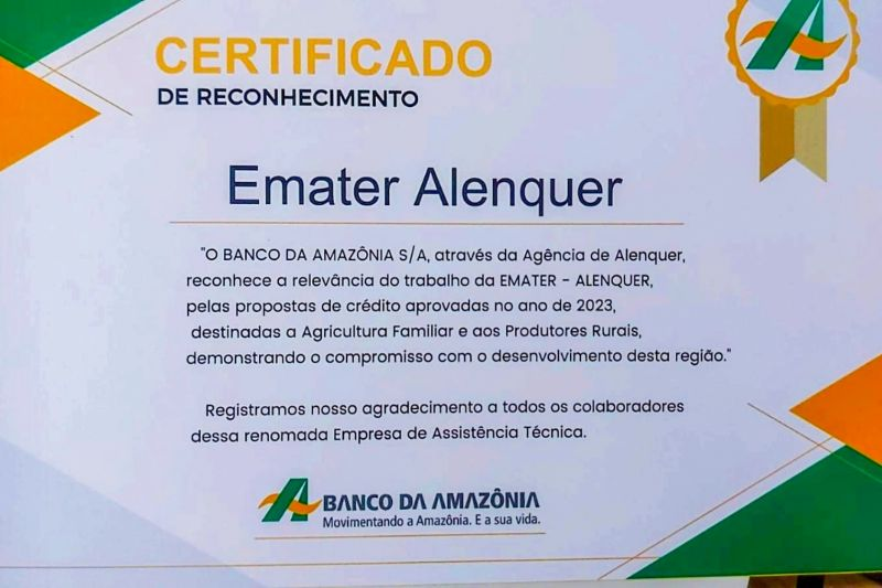 Homenagem - Em Alenquer, no Baixo Amazonas, o escritório local da Emater recebeu uma homenagem retrospectiva no início de 2024 pela performance modelo no segmento de crédito rural. O Certificado de Reconhecimento expressa, em texto, “que o Banco da Amazônia reconhece a relevância do trabalho da Emater-Alenquer pelas propostas de crédito aprovadas no ano de 2023” e “o compromisso com desenvolvimento sustentável”.
