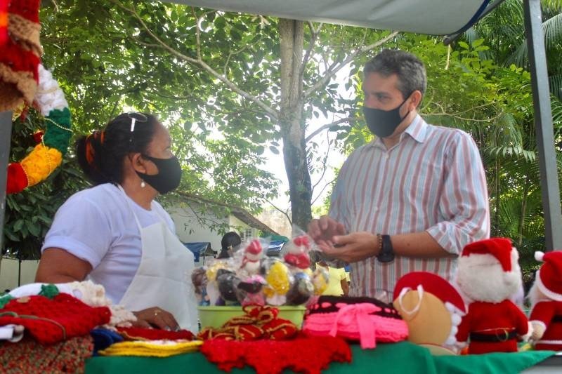 Artesã de artigos natalinos e outros intens artesanais conversa com visitante na feira Empósrio Sustentável