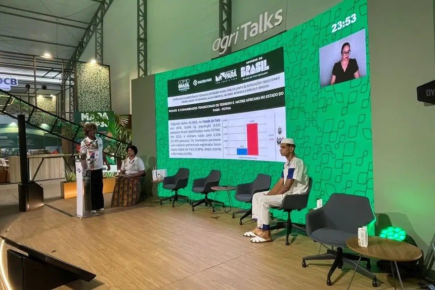 A Arena Agri Talks, na AgriZone, instalada na sede da Empresa Brasileira de Pesquisa Agropecuária (Embrapa) da Amazônia Oriental, foi palco de debate sobre as políticas públicas para Povos Tradicionais de Matriz Africana (Potma), neste domingo (16), durante a programação da Conferência das Nações Unidas sobre Mudança Climática do Clima (COP30), em Belém.