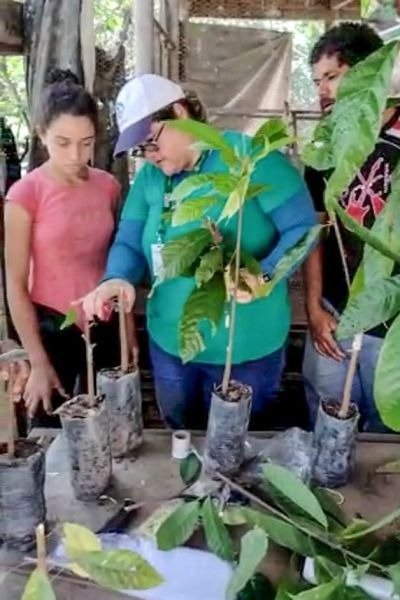 Na parte prática, executada pela engenheira florestal da Emater, Josie Helen Oliveira Ferreira, foram demonstradas as técnicas de garfagem no topo em fenda cheia, borbulhia e ramo lateral, com 200 mudas de cacau que foram doadas pela Secretaria Municipal de Agricultura.