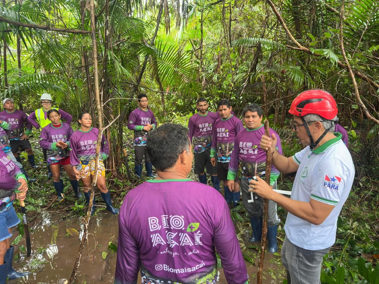 “A Cooperativa Bio+ Açaí e Ouro Verde são grandes parceiras nossas para poder levar essas oficinas. Nós temos a capacitação da Embrapa desde 2006 também. Então, em cada oficina, nós delimitamos uma área de 50 metros por 50 metros, dividimos em quatro quadrantes, fazemos inventário florestal, todo o processo de manejo. Deixamos aqueles 50m x 50m manejado, que vai servir como uma vitrine, para as pessoas das comunidades possam ver como é que é feito o processo de manejo e serve como uma unidade de observação”, explicou.