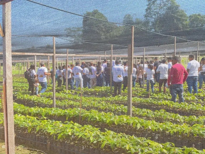 Durante o dia de campo, os participantes puderam aprender sobre técnicas de manejo de viveiros, escolha de mudas, uso de substratos, recipientes adequados e boas práticas na produção de cacau.